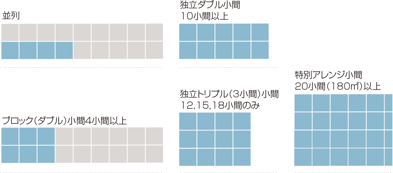 4~9小間 | 並列小間、ブロック小間より選択可能(高さ:4mまで使用可能 ※但し、並列小間は1mセットバック) |