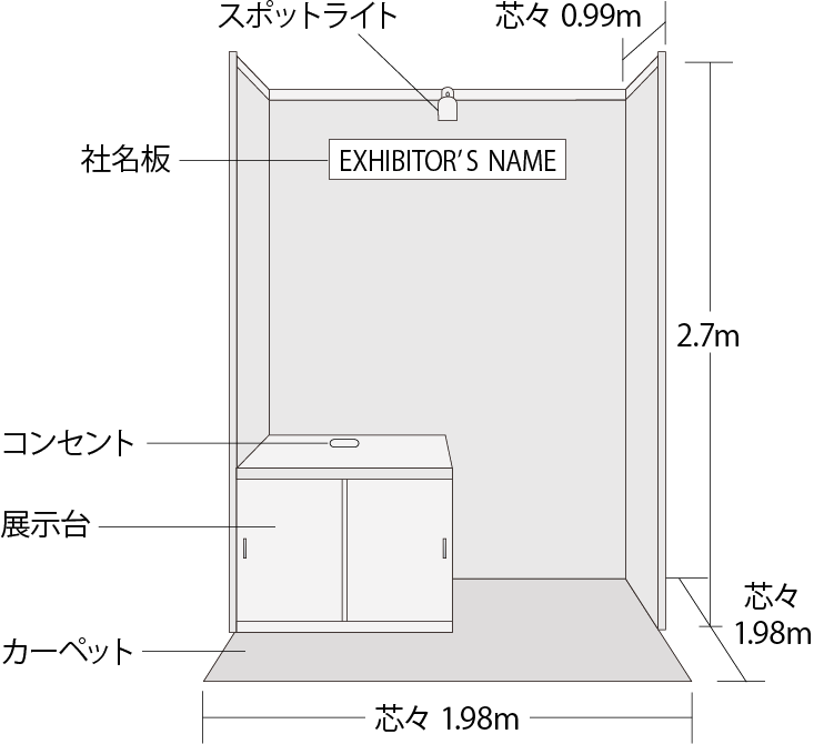 間口2.0m×奥行2.0mの展示スペース、間仕切り(後壁、側壁1m)、社名板、カーペット、